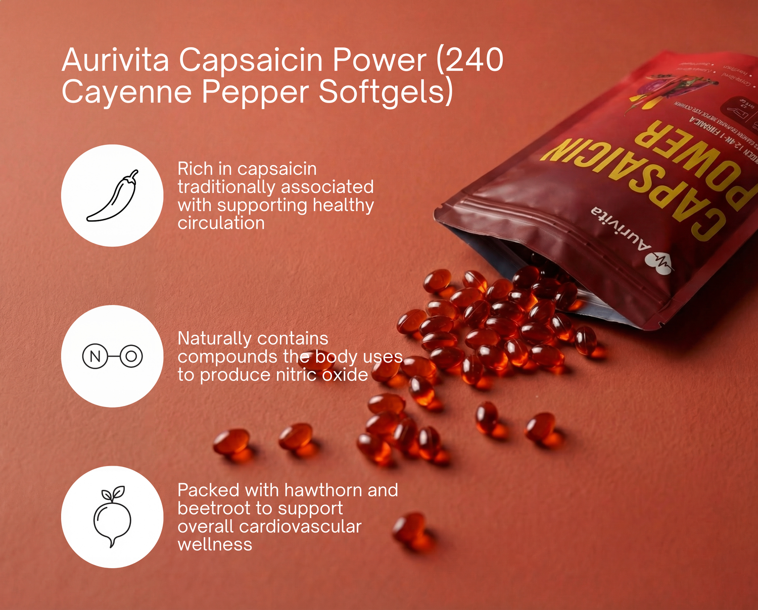 Aurivita Capsaicin Power is made from cayenne pepper extract, beetroot extract, and 10 other ingredients all designed to support vascular function.